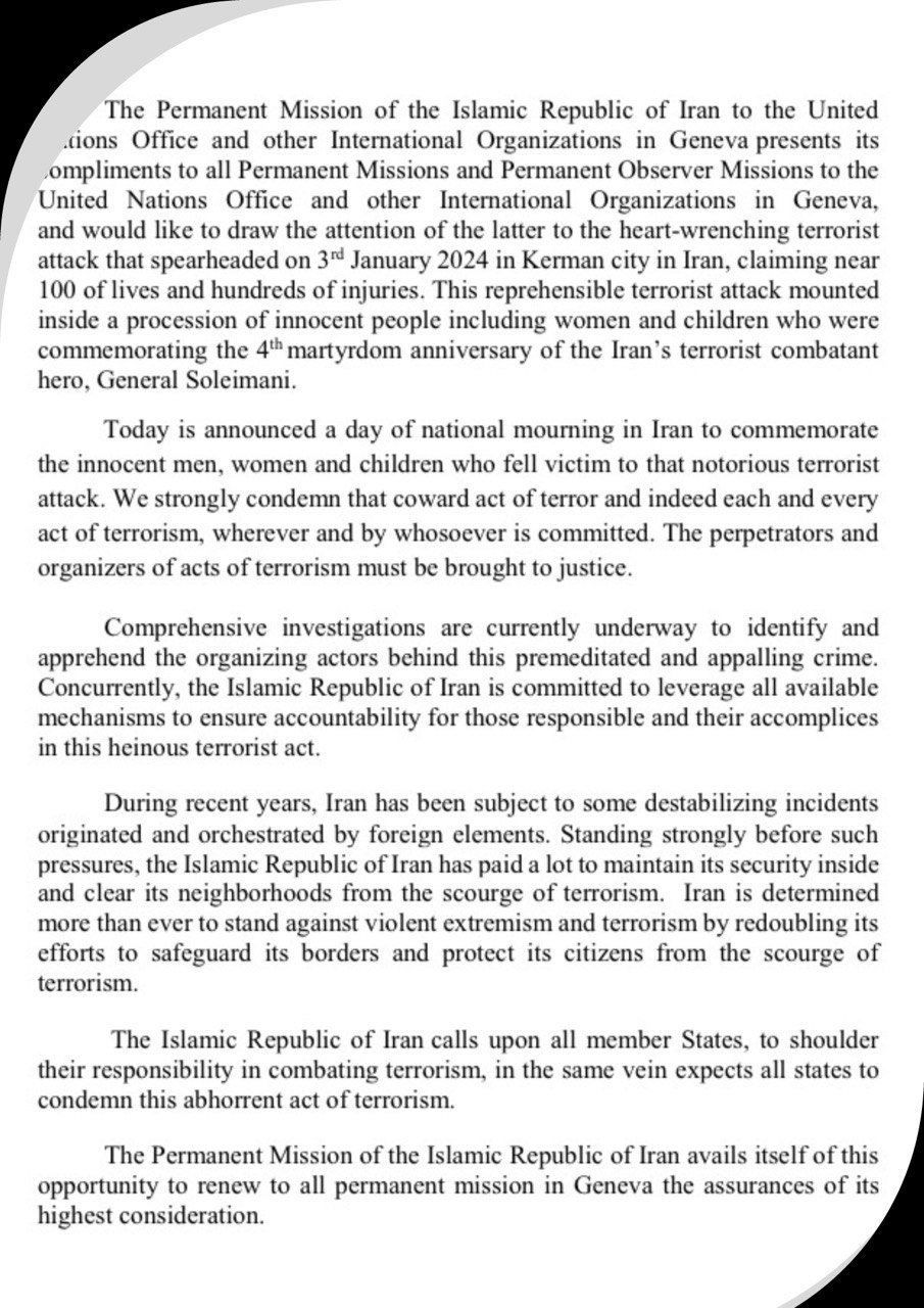 The Permanent Mission of the Islamic Republic of Iran to the United Nations Office and other International Organizations in Geneva presents its compliments to all Permanent Missions and Permanent Observer Missions to the United Nations Office and other International Organizations in Geneva, and would like to draw the attention of the latter to the heart-wrenching terrorist attack that spearheaded on 3rd January 2024 in Kerman city in Iran, claiming near 100 of lives and hundreds of injuries. This reprehensible terrorist attack mounted inside a procession of innocent people including women and children who were commemorating the 4th martyrdom anniversary of the Iran’s terrorist combatant hero, General Soleimani.